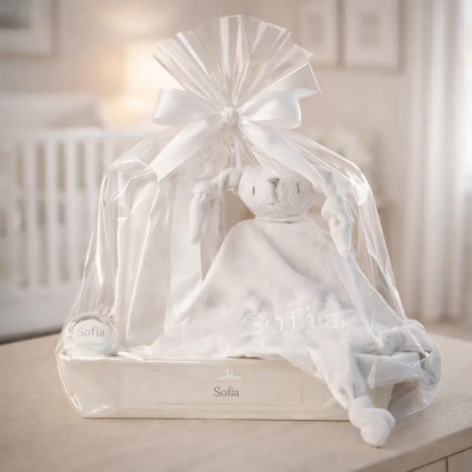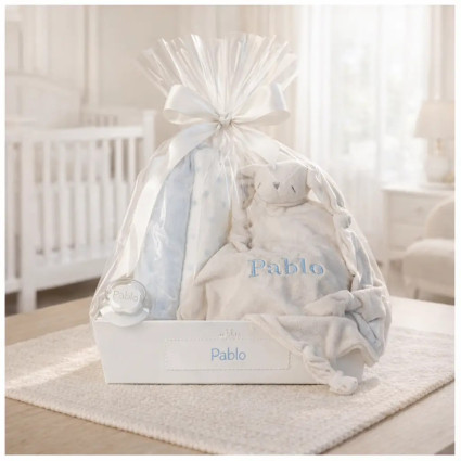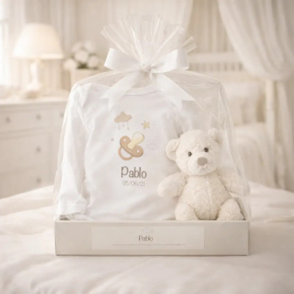 Oso de peluche y body personalizado con el nombre del bebé PERSONALIZABLE C367 $1,071.00 (21 reviews) Un tierno y abrazable regalo para el bebé recién nacido. Presentado en nuestra hermosa bandeja personalizada, incluye un body de 100% algodón, talla 6 meses, personalizado con una imagen para crear un recuerdo imborrable, y nuestro suave doudou Big Bunny, que acompañará al bebé en sus dulces sueños y lo hará sentir más seguro al abrazarlo. COMPRAR