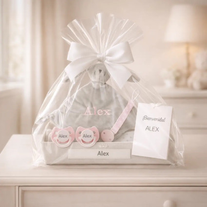 Pack Doudou y 2 chupones con nombre y sujetachupón PERSONALIZABLE C355 $1,071.00 (2 reviews) Si buscas un regalo para un bebé recién nacido con un alto grado de personalización, este paquete es ideal. Presentado en nuestra hermosa bandeja personalizada, incluye dos chupones, un sujetachupón para colocar en la ropa del bebé y evitar que el chupón se caiga o se pierda, y nuestro tierno doudou Big Bunny, que acompañará al bebé en sus dulces sueños y... COMPRAR